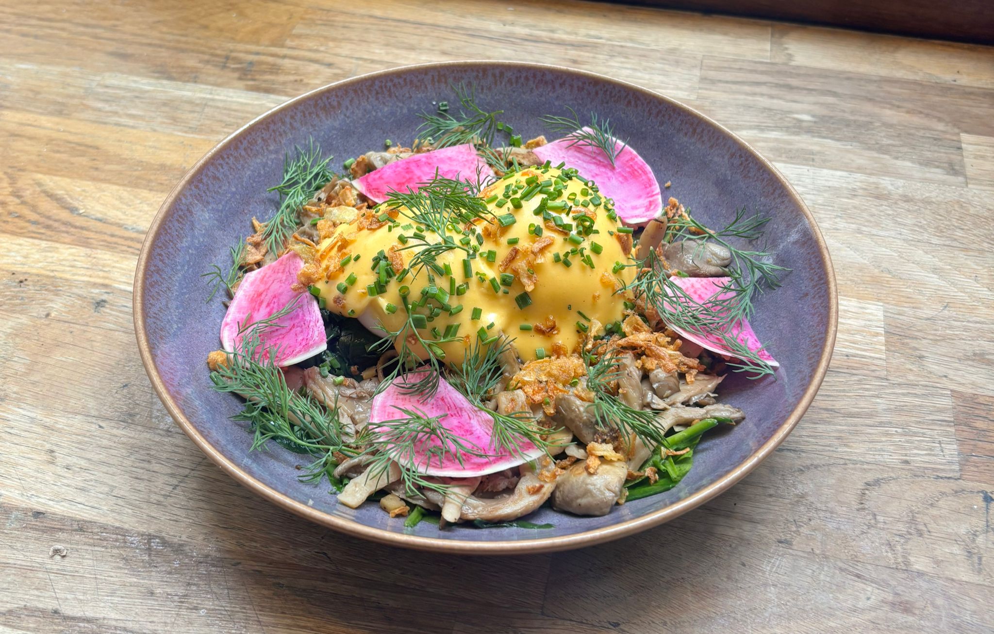 Œufs mollets x 2 + pain de mie brioché + sauce au fromage comte + pousses d’épinards & shiitake et du champignons et oignons croustillants