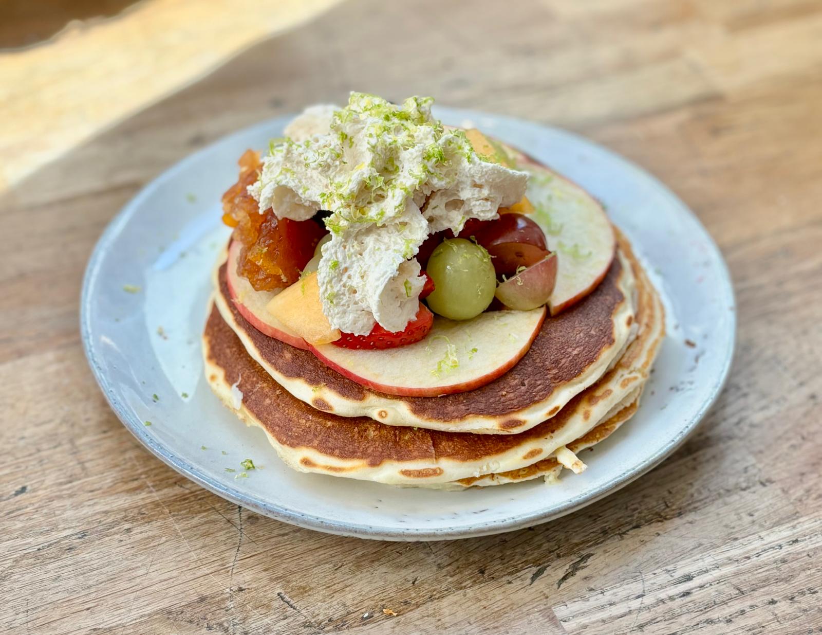 Trois pancakes moelleux avec les fruits frais de saison avec un peu de confiture et une chantilly maison et autant de sirop d'agave que vous le souhaitez