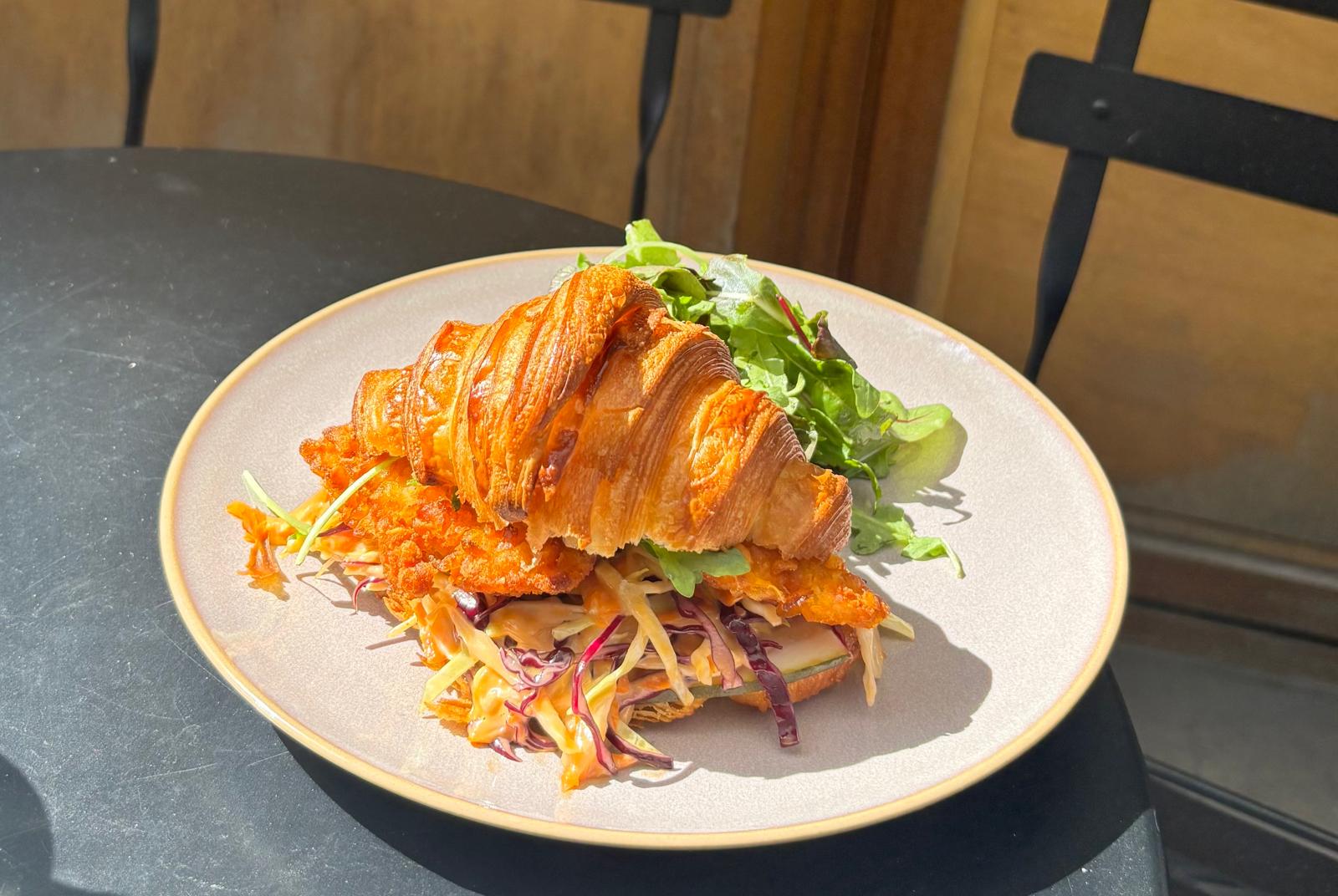 Notre croissant fourré au poulet frit avec cornichons et salade de chou marinée à l'essence épicée! Servi avec une salade mesclun.