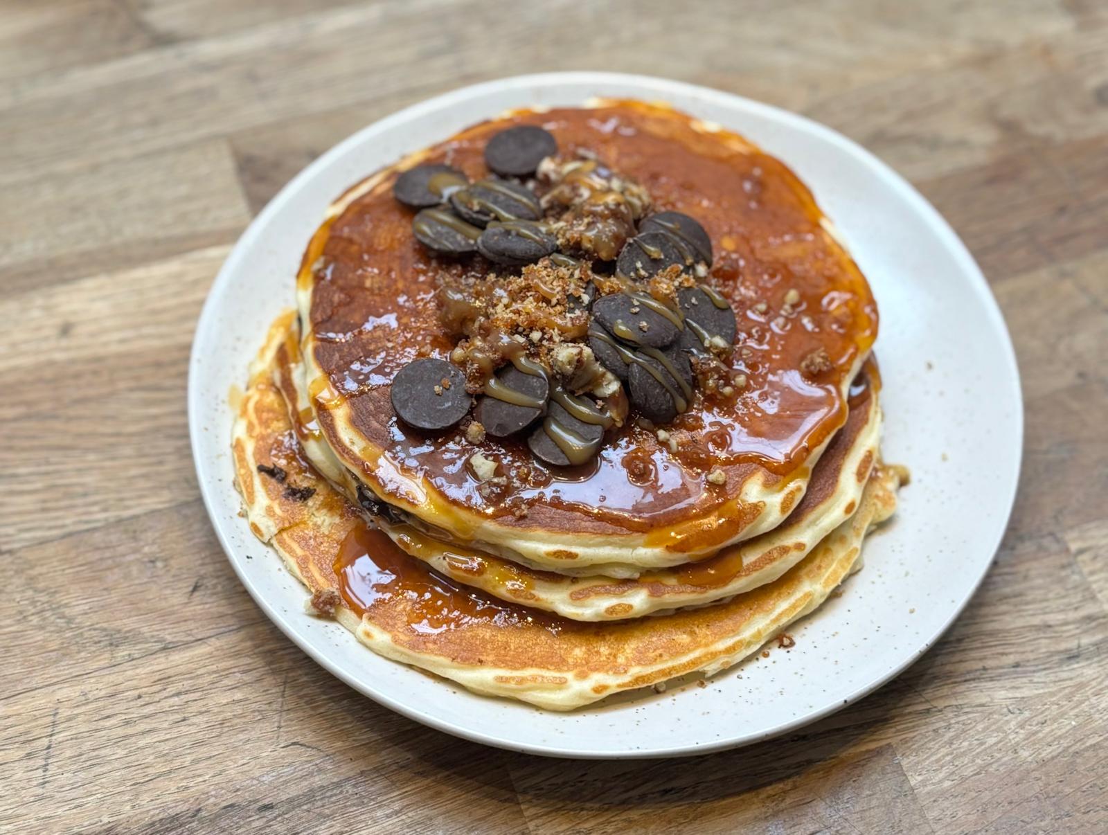 Trois pancakes moelleux nappé de caramel au beurre salé et noix de pécan torréfiées caramélisées en plus des pépites de chocolat sur le dessus et à l'intérieur des pancakes !